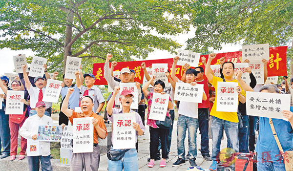 ■的士司機在位於台北的民進黨中央黨部外集會,呼籲當局承認「九二共識」,以增加陸客來台。 資料圖片